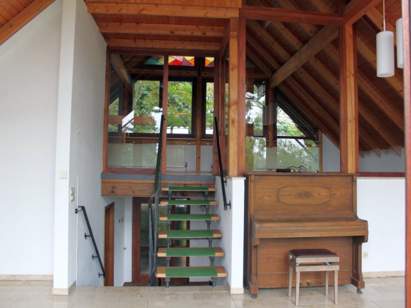 – Galerie abgetrennt durch Glasfront, extra Raumhöhe bis zum Giebel, Mosaikfenster im Giebelbereich Richtung Norden