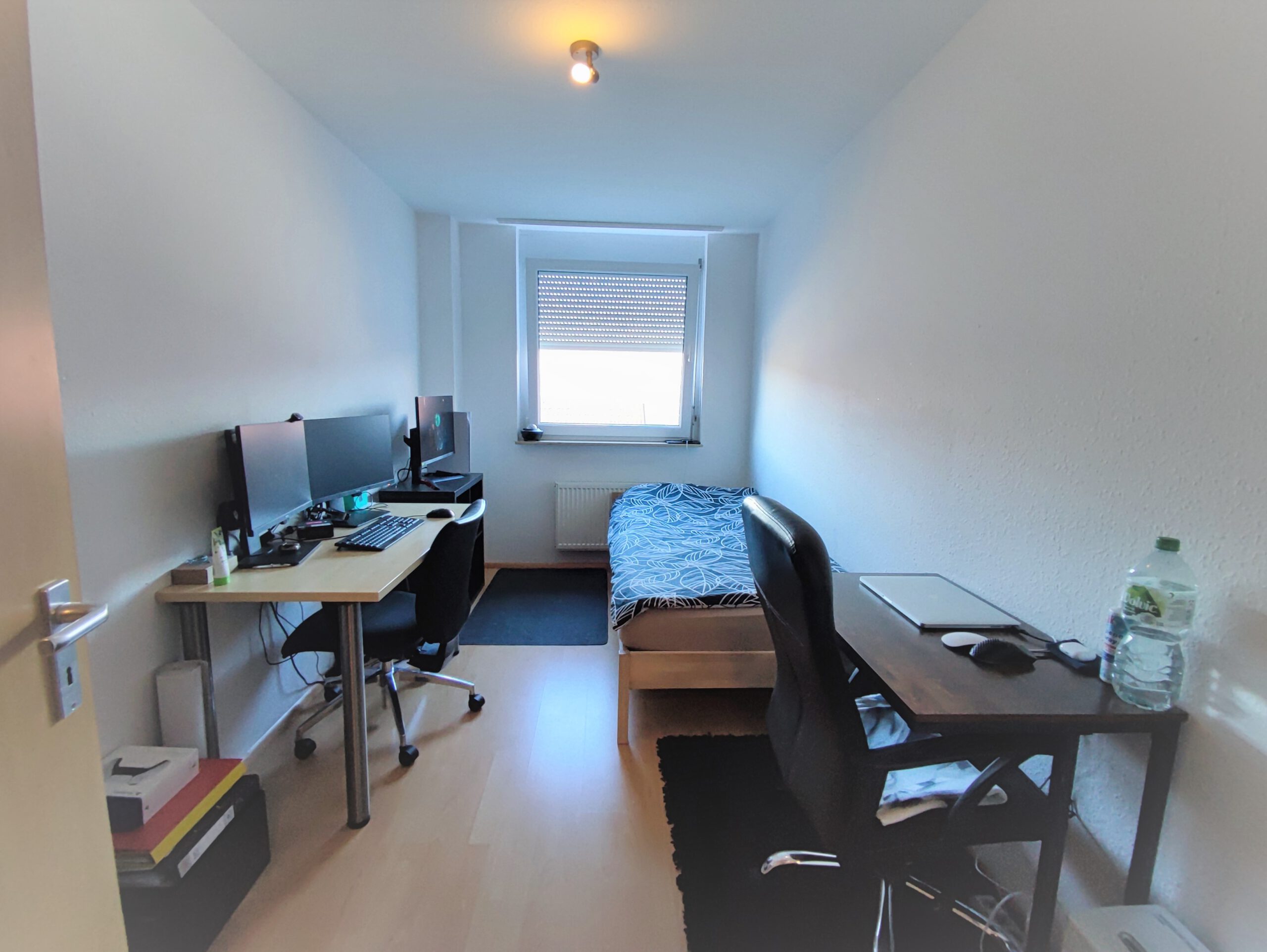 Sie betreten die helle 4 Zimmer Wohnung durch eine rechteckig geschnittene, längliche Diele, an deren Ende sich das erste von drei Schlaf-/Kinder-Arbeitszimmern befindet.